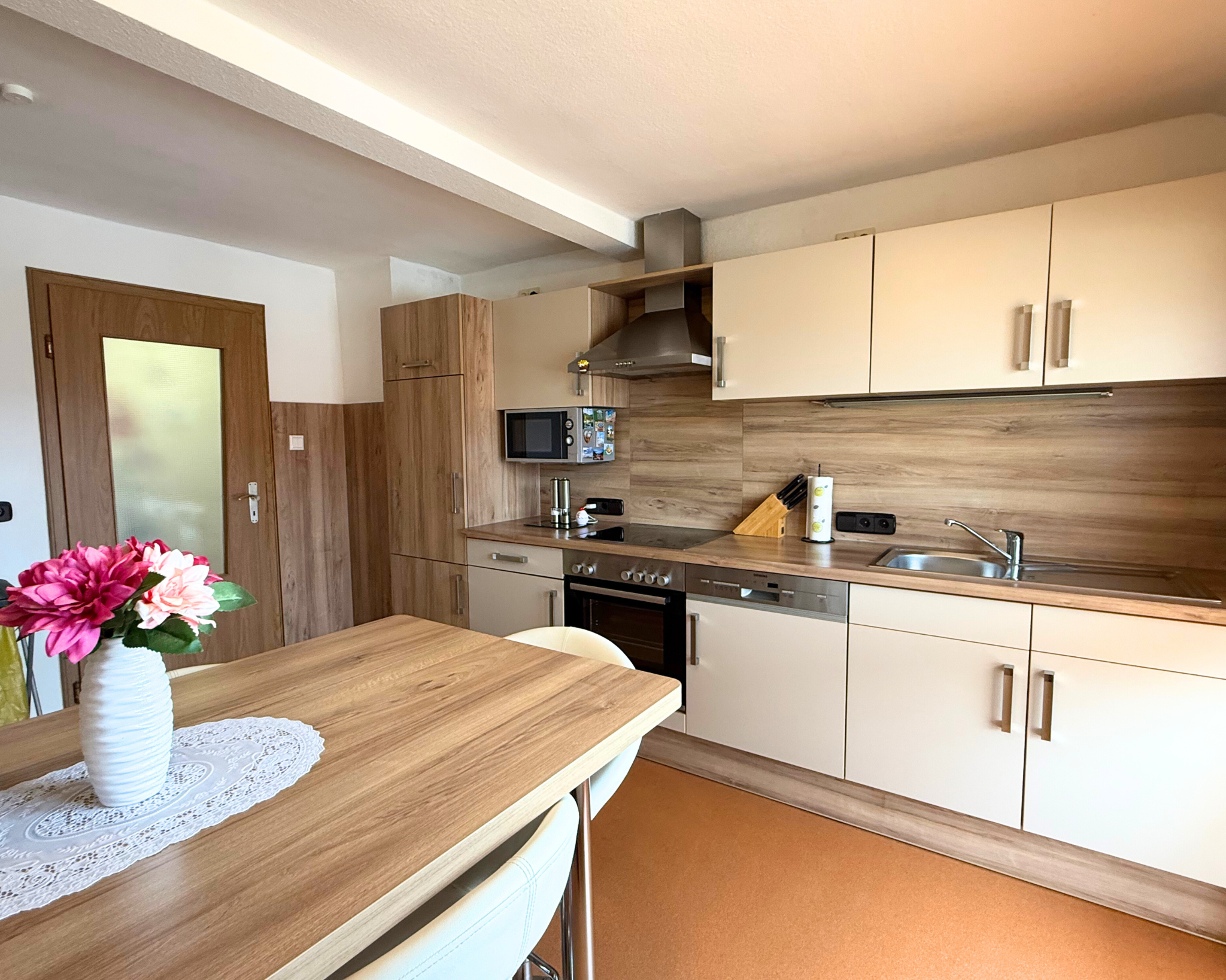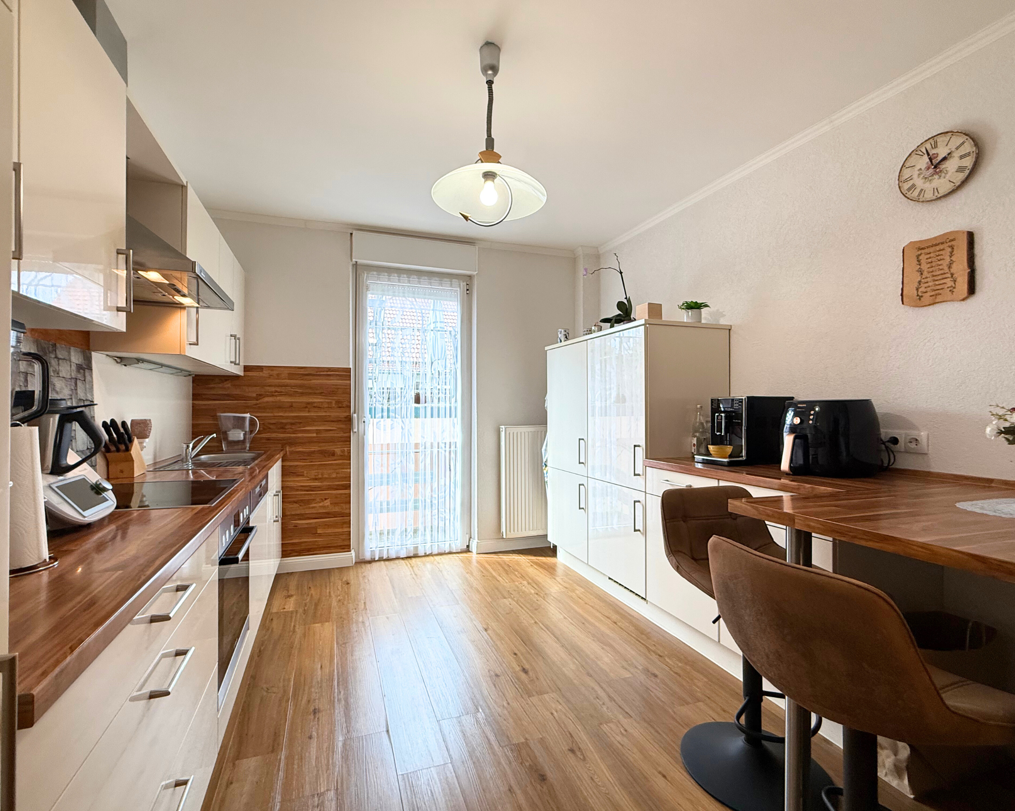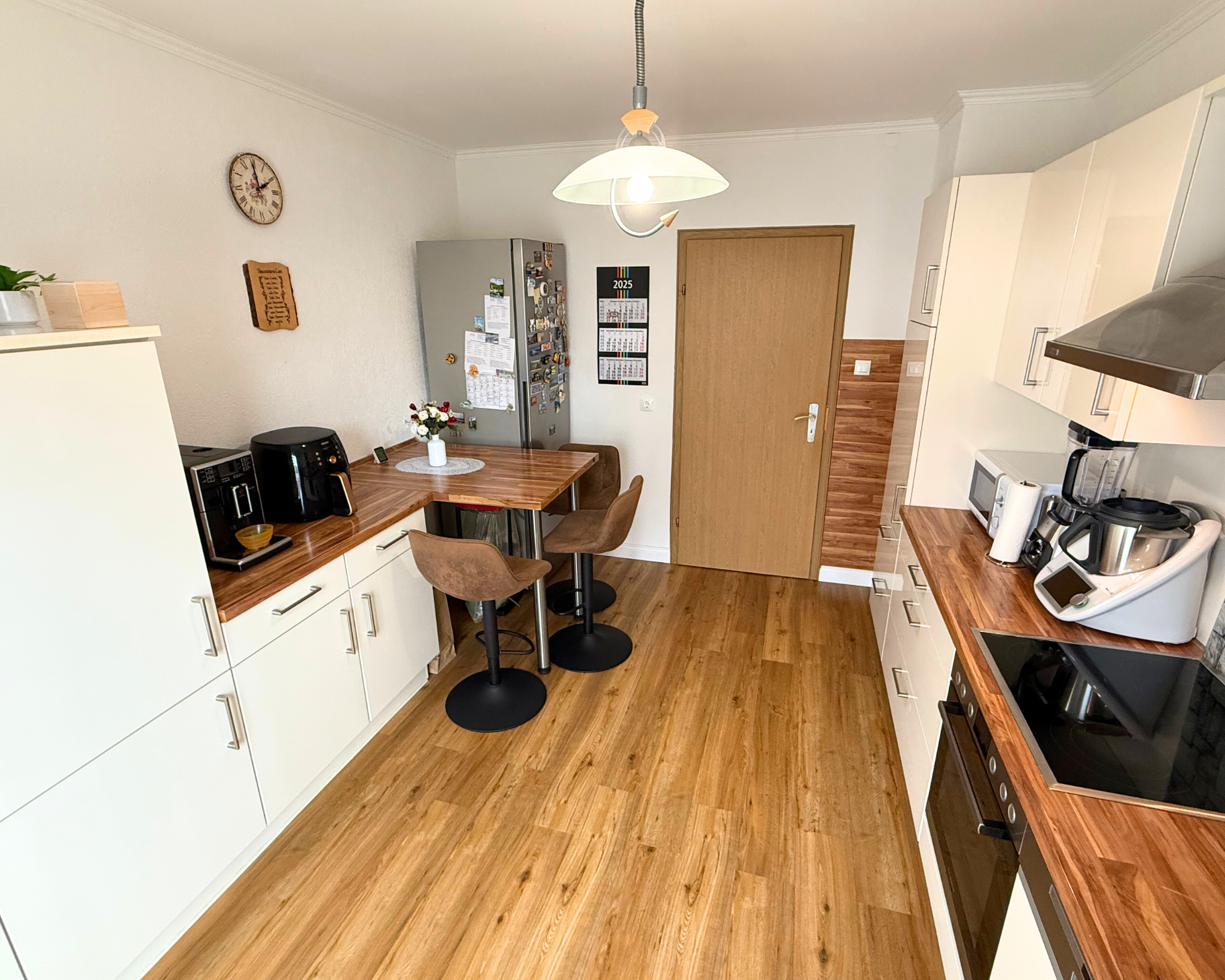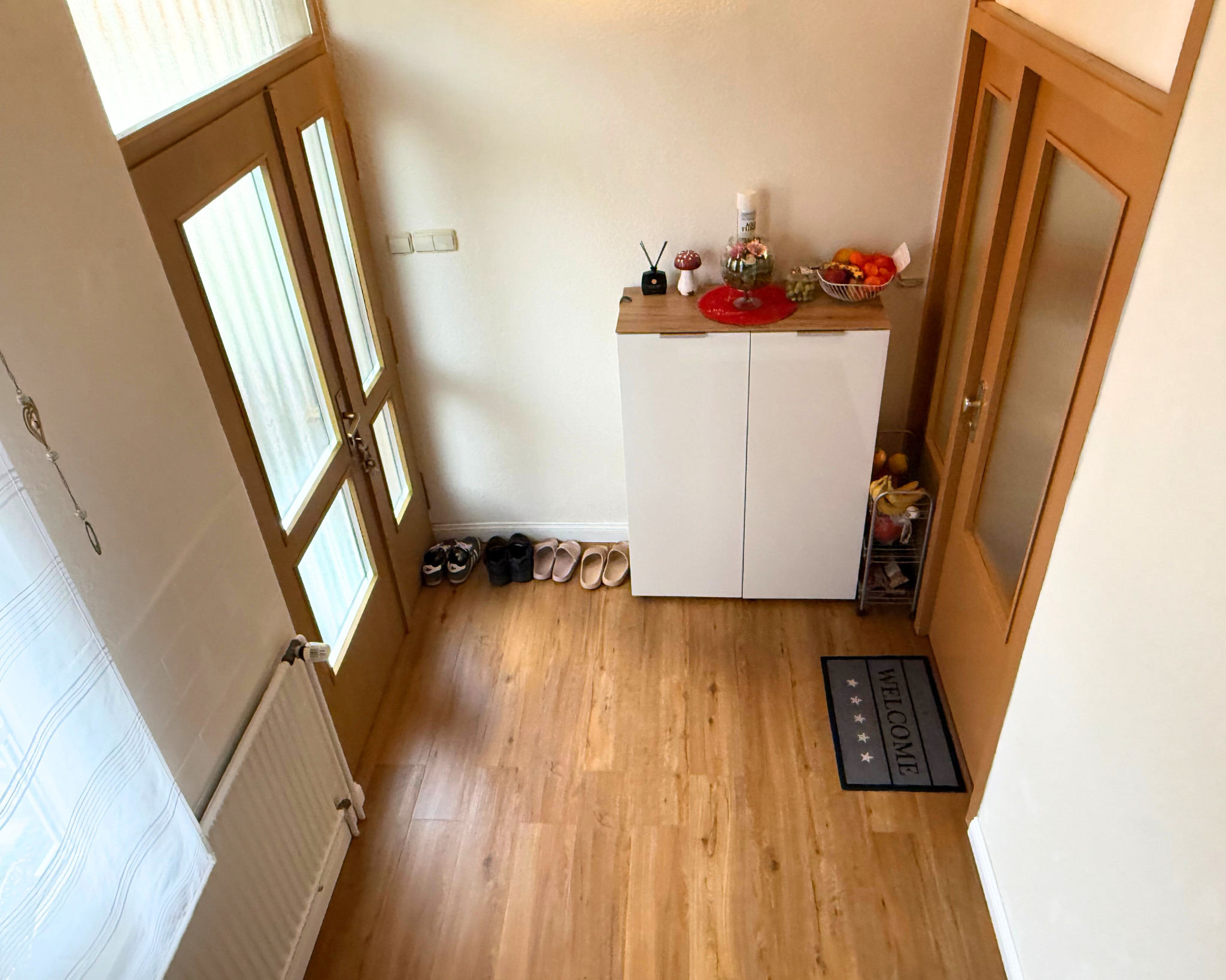Im Erdgeschoss befindet sich eine 3-Zimmer-Wohnung mit Abstellraum und einer modernen Einbauküche inklusive Elektrogeräten. Die Wohnung wurde 2020 umfassend modernisiert – Böden, Stromleitungen und Wände wurden erneuert. Im Jahr 2023 folgte die Sanierung des Badezimmers inklusive neuer Wasserleitungen.
