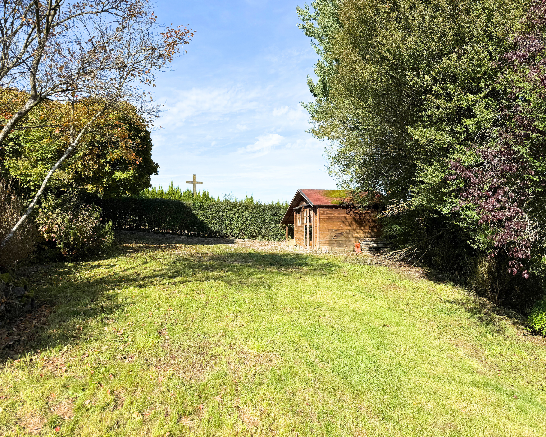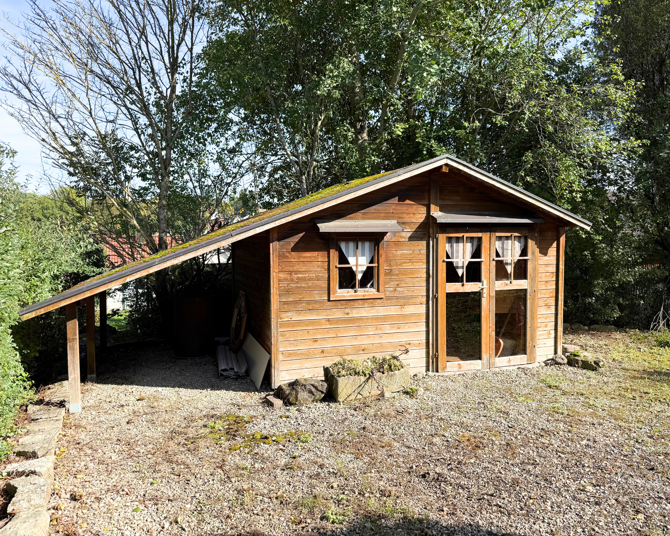 Der weitläufige Garten mit Gartenhaus lädt zum Entspannen, Gärtnern oder Spielen ein. Eine Terrasse direkt am Haus bietet den idealen Platz für gemütliche Stunden im Freien.